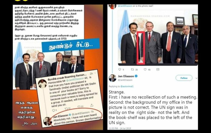 அதாவது, மு.க. ஸ்டாலினை மாபெரும் ஆளுமையாக ‘போலியாக கட்டமைக்கும்’ திமுகவின் முயற்சிக்கு – ஐநாவின் முன்னாள் துணைப் பொதுச் செயலாளர் ஜான் எலியாசன் நேரடியாக மறுப்பு தெரிவித்துள்ளார். இந்த விவகாரம் விநோதமானது (strange), வெட்கம் கெட்டது (brazen), பொய்ப்பித்தலாட்டம் என்பதாகவெல்லாம் அவர் திமுகவினரை விமர்சித்துள்ளார்.